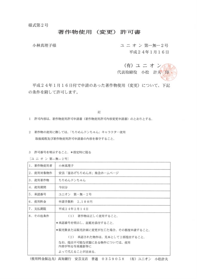 『ちりめんドンちゃん』キャラクターの著作物使用(変更)許可書