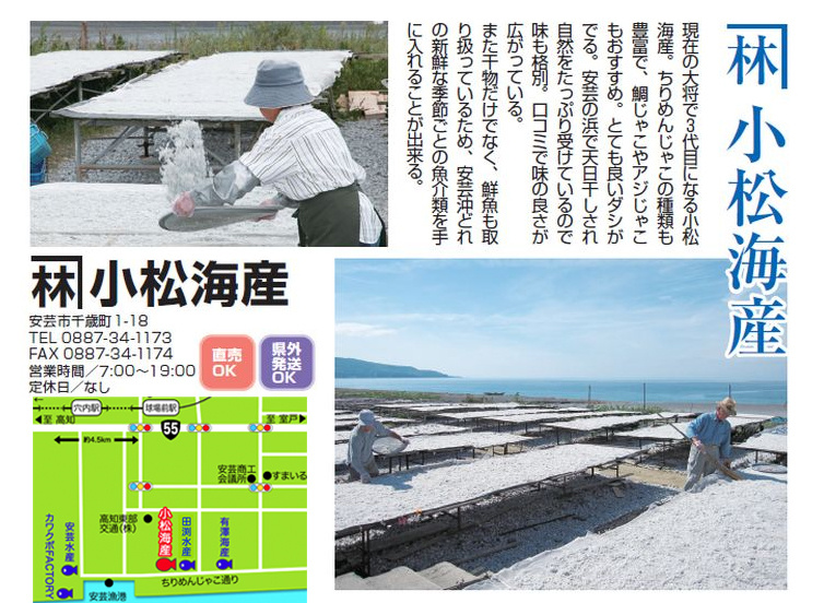 現在の大将で3代目になる小松海産。ちりめんじゃこの種類も豊富で、鯛じゃこやアジじゃこもおすすめ。とても良いダシがでる。安芸の浜で天日干しされ自然をたっぷり受けているので味も格別。口コミで味の良さが広がっている。